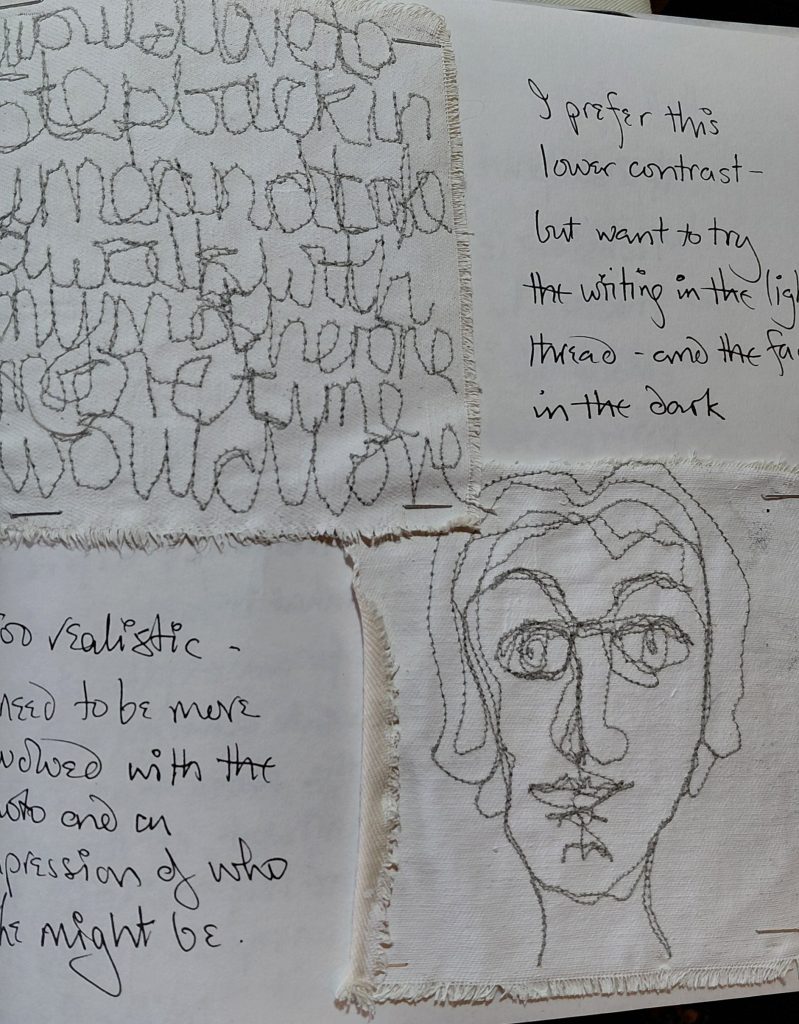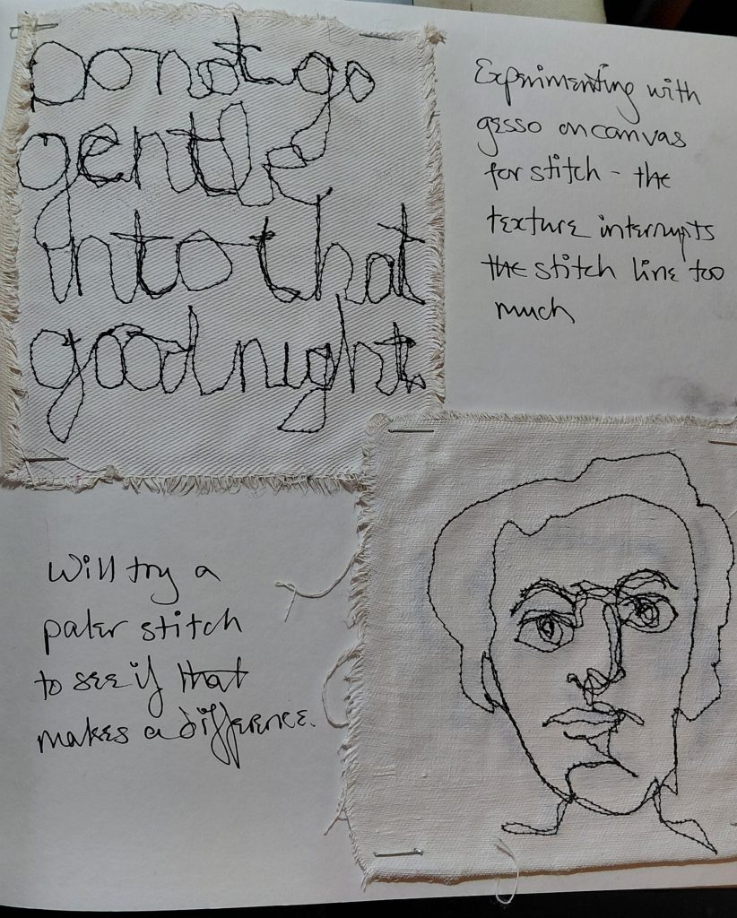 I stitched in black on gesso’d canvas and in grey on gesso’d canvas, but neither sample is working for me at the moment… I will let that idea rest in the background for now